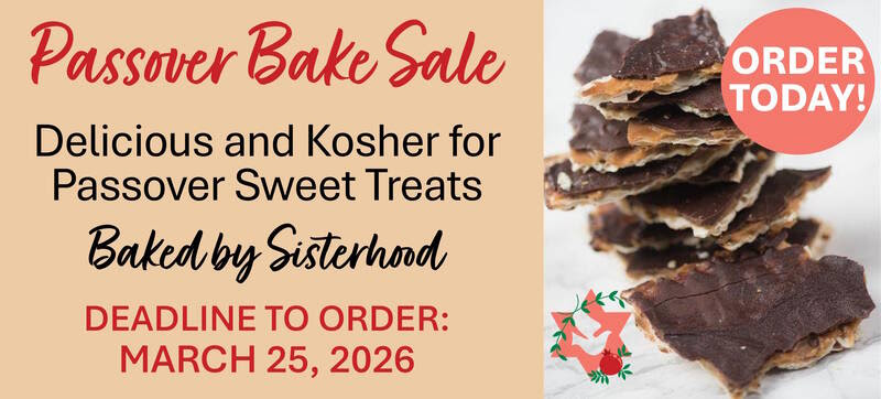 Get ready for Passover with delicious homemade treats from the Sisterhood Baking Club! We're offering a delectable selection of baked goods, all made with love and the finest ingredients. Treat yourself and your family to our mouthwatering macaroons, decadent matzah crunch, or chocolate-dipped orange slices.